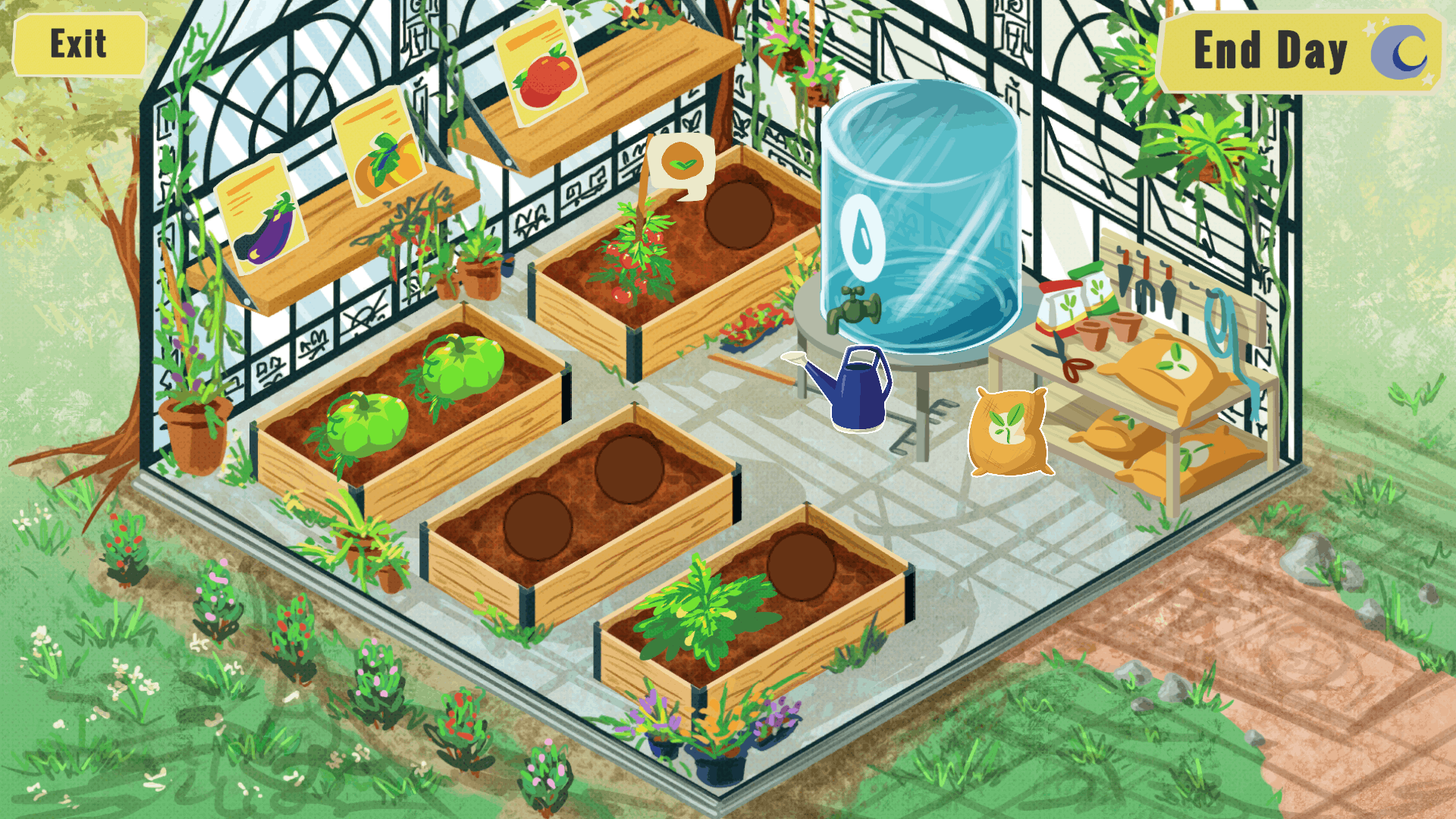Sustainably manage your own little greenhouse to grow a variety of vegetables. Choose where to plant your vegetables and take care of them by providing for their needs to watch them grow day by day.